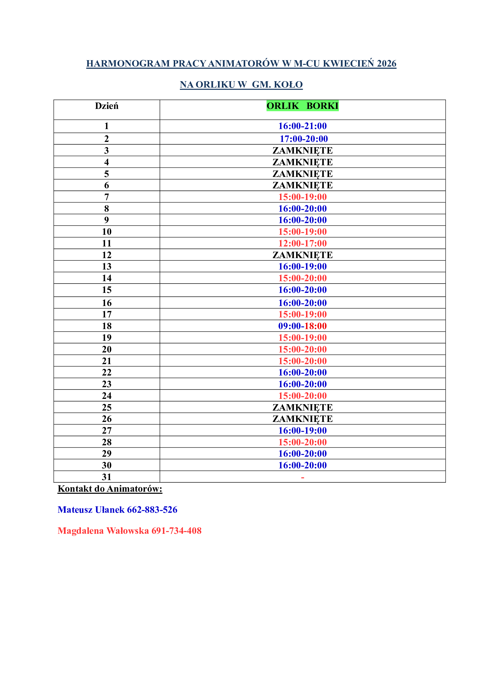 Harmonogram pracy Animatorów orlika Borki na kwiecień