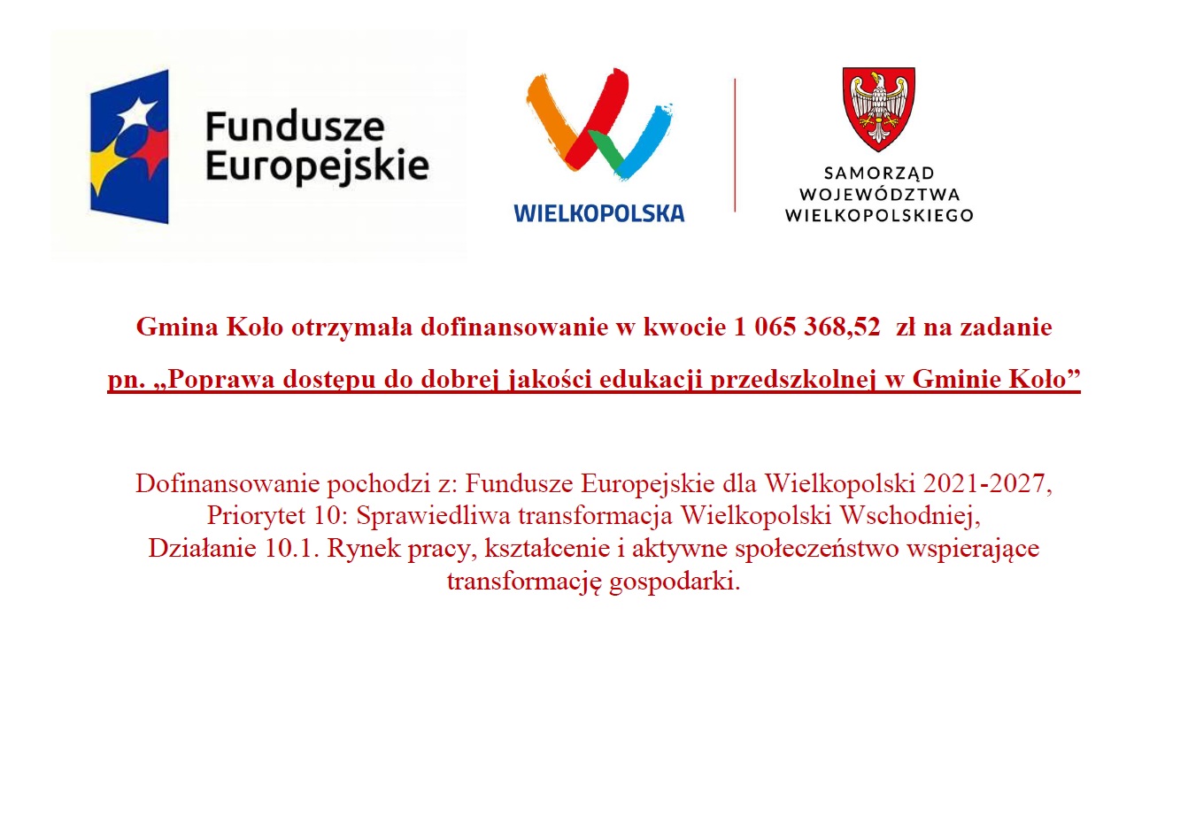 Informujemy, że Gmina Koło uzyskała dotację z Unii Europejskiej na realizację projektu pn.: „Poprawa dostępu do dobrej jakości edukacji przedszkolnej w Gminie Koło” Projekt realizujemy aby podnieść jakość edukacji na terenie Gminy Koło. Głównym celem projektu jest wsparcie edukacji przedszkolnej w Gminie Koło, znajdującejsię na terenie Wielkopolski Wschodniej, poprzez rozwinięcie Publicznego Przedszkola we Wrzącej Wielkiej, Publicznego Przedszkola w Powierciu, Oddziału Przedszkolnego przy SP im. Idei Olimpijskiej w Sokołowie oraz Oddziału Przedszkolnego przy SP im. Wisławy Szymborskiej w Kiełczewie Smużnym Pierwszym jako miejsc wszechstronnego rozwoju dzieci, zgodnie z ich indywidualnymi potrzebami. Projekt realizowany będzie w okresie: 01.11.2024 – 30.06.2027 W projekcie planujemy: 1) organizację i prowadzenie dodatkowych zajęć (indywidualnych i grupowych) oraz wyjazdów edukacyjnych 2) zakup doposażenia i pomocy dydaktycznych, które zostaną wykorzystane do prowadzenia zajęć dodatkowych 3) organizację wsparcia dla nauczycieli w formie szkoleń, kursów i studiów podyplomowych Projekt skierowany jest do grupy docelowej – 2 oddziałów przedszkolnych przy SP i 2 przedszkoli, 208 dzieci w wieku przedszkolnym (w tym 8 dzieci ze specjalnymi potrzebami edukacyjnymi i 2 dzieci z niepełnosprawnością) oraz 27 nauczycieli. Efektem projektu będzie: - liczba szkół i placówek systemu oświaty objętych wsparciem: 4 - liczba dzieci objętych dodatkowymi zajęciami w edukacji przedszkolnej: 208 os. - liczba przedstawicieli kadry szkół i placówek systemu oświaty objętych wsparciem: 27 os. - liczba przedstawicieli kadry szkół i placówek systemu oświaty, którzy uzyskali kwalifikacje po opuszczeniu programu: 25 os. (min. 90%).
