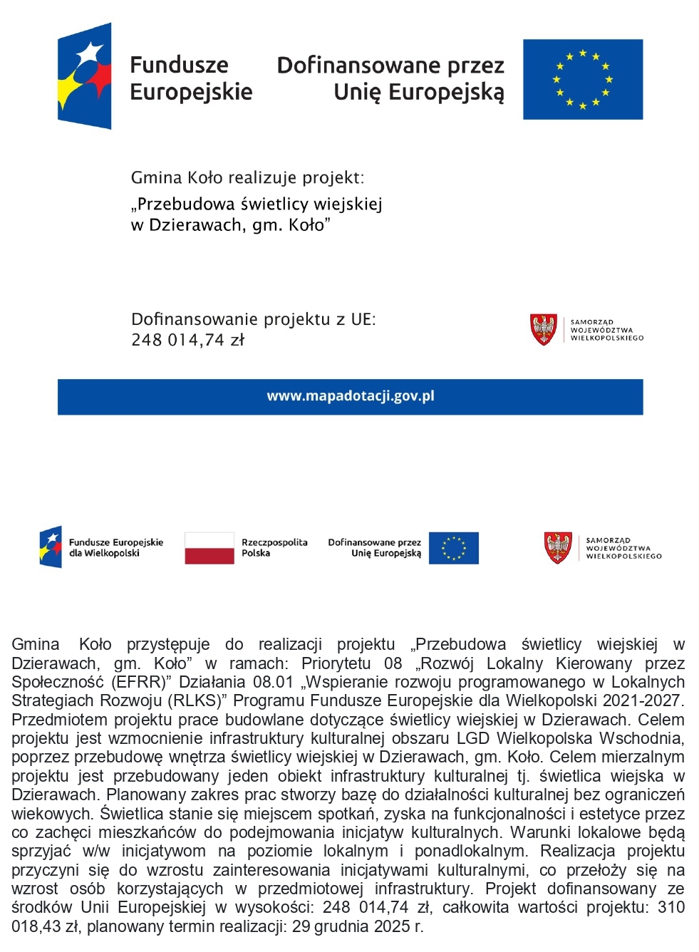 Gmina Koło przystępuje do realizacji projektu „Przebudowa świetlicy wiejskiej w Dzierawach, gm. Koło” w ramach: Priorytetu 08 „Rozwój Lokalny Kierowany przez Społeczność (EFRR)” Działania 08.01 „Wspieranie rozwoju programowanego w Lokalnych Strategiach Rozwoju (RLKS)” Programu Fundusze Europejskie dla Wielkopolski 2021-2027. Przedmiotem projektu prace budowlane dotyczące świetlicy wiejskiej w Dzierawach. Celem projektu jest wzmocnienie infrastruktury kulturalnej obszaru LGD Wielkopolska Wschodnia, poprzez przebudowę wnętrza świetlicy wiejskiej w Dzierawach, gm. Koło. Celem mierzalnym projektu jest przebudowany jeden obiekt infrastruktury kulturalnej tj. świetlica wiejska w Dzierawach. Planowany zakres prac stworzy bazę do działalności kulturalnej bez ograniczeń wiekowych. Świetlica stanie się miejscem spotkań, zyska na funkcjonalności i estetyce przez co zachęci mieszkańców do podejmowania inicjatyw kulturalnych. Warunki lokalowe będą sprzyjać w/w inicjatywom na poziomie lokalnym i ponadlokalnym. Realizacja projektu przyczyni się do wzrostu zainteresowania inicjatywami kulturalnymi, co przełoży się na wzrost osób korzystających w przedmiotowej infrastruktury.